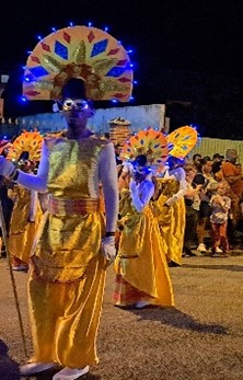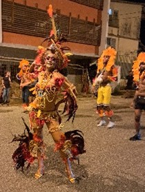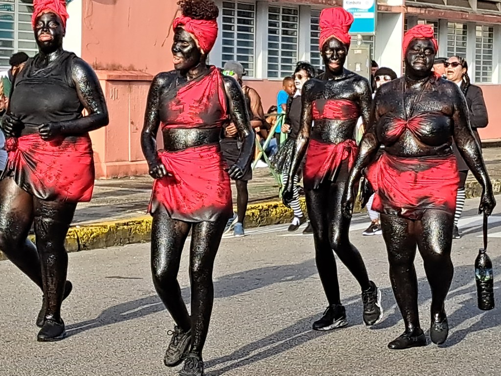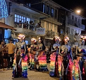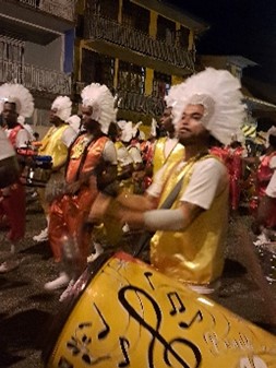 - Les Parades : tous les dimanches vers 17 heures , les associations carnavalesques défilent dans les rues de Cayenne qui sont fermées, avec service d’ordre et contrôle des entrées (il y a eu pas mal de violences lors des derniers carnavals d’ « avant COVID ») : costumes (qui changent à chaque défilés !!), batucadas, chants, danses… Les « neg marrons » (photo) sont traditionnels.