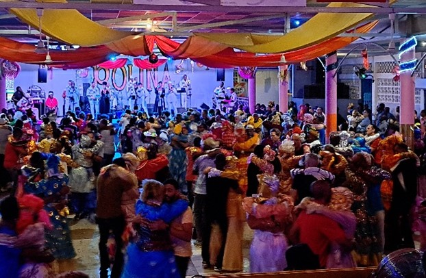 - Les « Bals parés-masqués » du samedi soir, dans les « universités » (= dancing… haut-lieu d’études sociologiques !!), où, au son de l’orchestre, les « Touloulous » vont inviter leurs cavaliers à danser « collé-serré » sur les musiques carnavalesques. Leurs costumes, qui miment les habits des bourgeoises du 19ème, les rendent anonymes, mais, au déhanché, on reconnait tout de suite les métropolitaines… il n’y a pas de doute : les « métros » ne savent pas danser !!