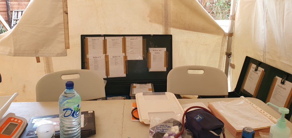 Première difficulté, identifier le problème de santé et ce n’est pas toujours évident. On règle la bobologie sur place. C’est important la bobologie (mal de tête, mal de ventre, …) et pas forcément facile quand on est habitué à exercer à l’hôpital. Je m’en rends compte chaque fois que je fais de la médecine générale. Ce d’autant que certains symptômes peuvent correspondre à des états d’anxiété ou de syndrome de stress post traumatique. Les cas qui nécessitent des investigations sont orientés vers la PASS de Maturia ou de l’hôpital. Bilan : une centaine d’orientations sociales et 14 consultations médicales. On démonte finalement les tentes et on déjeune ensemble sur place en faisant le debriefing.