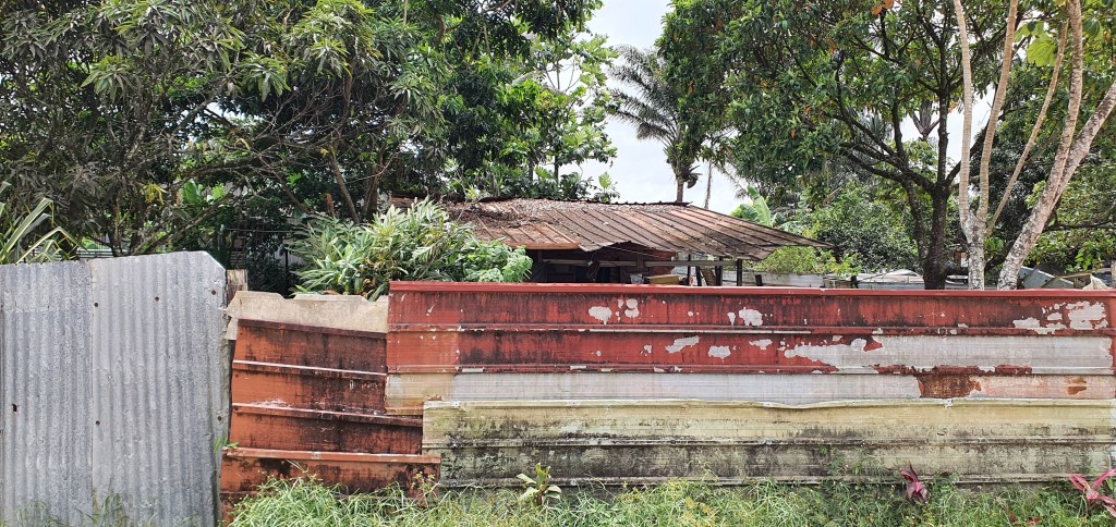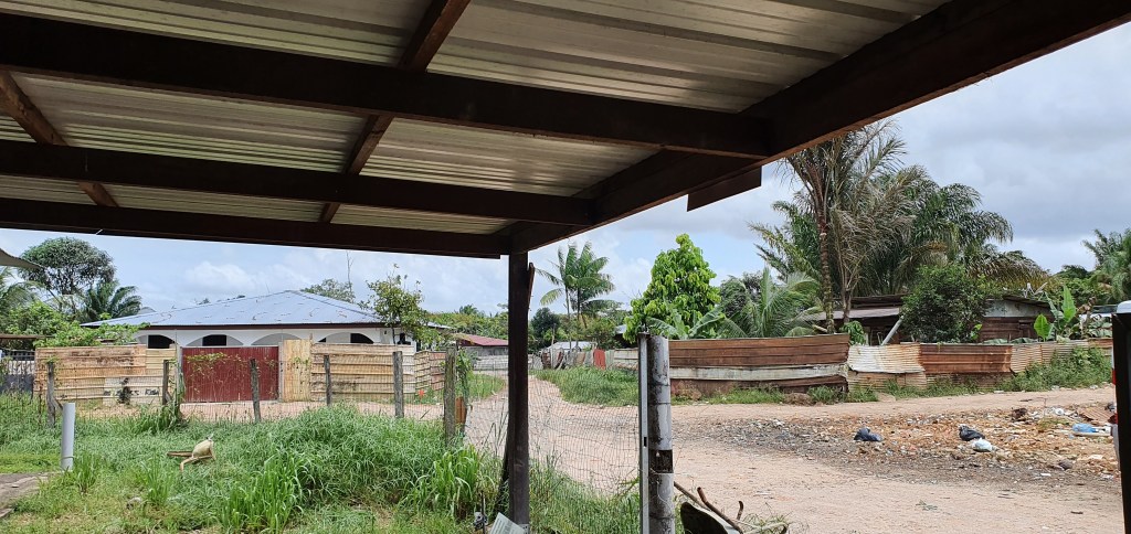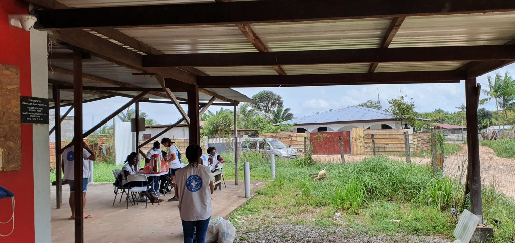 Lundi matin, levé 5h pour être à MdM à 7h en vélo. Ce devait être une matinée d’observation mais comme il manque de chauffeurs et de médecins ce jour-là, j’ai fait les deux. Je suis le premier arrivé (j’avais oublié le ¼ d’heure guyanais). Les bénévoles arrivent un à un. Nous nous étions beaucoup posés la question pour le programme « accès aux soins en zone rurale dans les Combrailles » de faire participer les « bénéficiaires » du programme à nos activités. Ici la très grande majorité des bénévoles sont dans une situation assez proche de ceux que l’on va soigner. C’est une façon pour eux de se sentir utile et de tromper l’ennui (j’imagine que cela peut également être un atout pour obtenir des papiers). Ils connaissent la culture, la langue, ont été formés aux problèmes sociaux. Certains médiateurs parlent 3-4 langues (portugais, créole (il y en a plus de 10 différents), espagnol…). Ambiance très sympa, on discute autour d’un café en mangeant un fromage de vache local. On parle aussi de Claire Dugleux, la dernière coordinatrice du Rescorda dans les Combrailles et qui est passée ici ensuite. Chargement des camions et départ pour un site informel à Matouri. Pendant le trajet, j’ai droit à un cours de créole comparé (haïtien, guyanais, antillais). On s’installe dans un carbet prêté par une association et où se sont établis des squatteurs. On commence d’ailleurs par débarrasser leurs ordures. Le quartier est similaire à celui où j’avais été pour l’enquête hantavirus. Chemins défoncés, maisons allant de la villa au carbet en ruine, cintrées d’une palissade en tôle et bien sûr, des tas d’ordure ! Nous sommes installés juste en face de l’un d’entre eux.