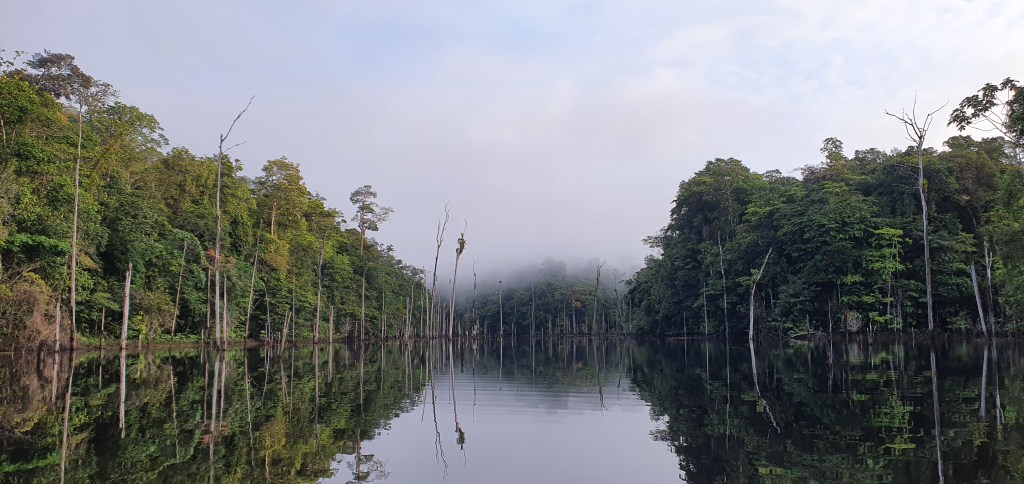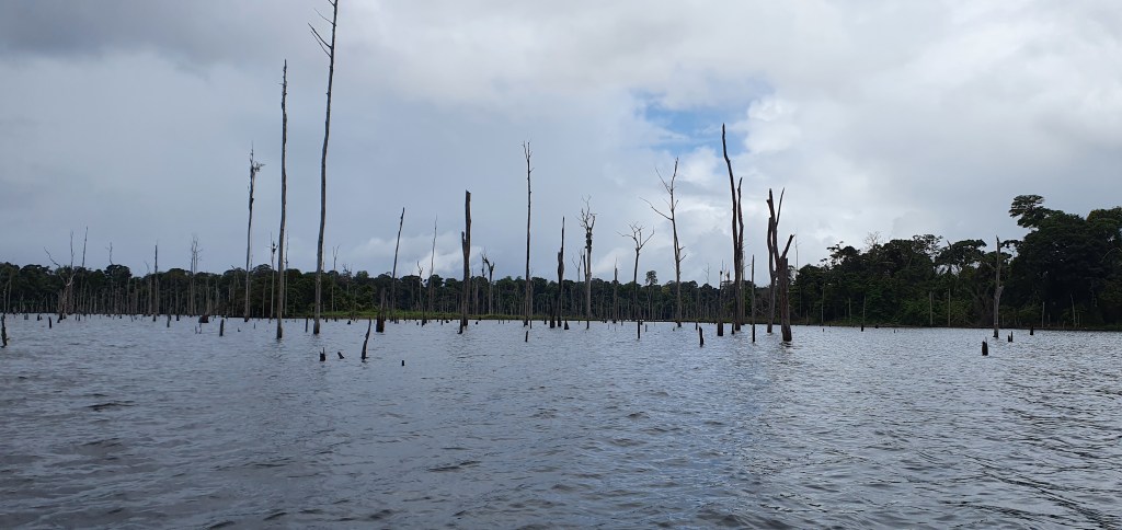Les arbres morts qui restent dans l’eau sont des essences rares indemnes d’insectes dans leur partie immergée. Tout comme pour l’or, notre système capitaliste est incapable de résister quand il s’agit de réaliser un profit en exploitant une ressource naturelle. Une entreprise canadienne a déboisé un espace près du lac pour exploiter le bois. D’énormes barges vont circuler sur le lac pour déraciner les arbres. Une partie du bois sera vendue, probablement en Chine (il faut savoir qu’on a du mal à trouver du bois en Guyane !). La majeure partie sera brulée pour faire de l’énergie. Adieu au nouvel écosystème qui s’était mis en place. C’est un peu déprimant.